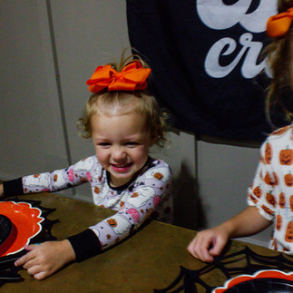A Halloween themed night at home might just be my favorite kind of fun — especially when it involves pizza shaped like a jack-o’-lantern and a table full of giggles. This little dinner party was such a hit! Between the themed treats, playful décor, and a monster mash dance party, it was the perfect little family night together.